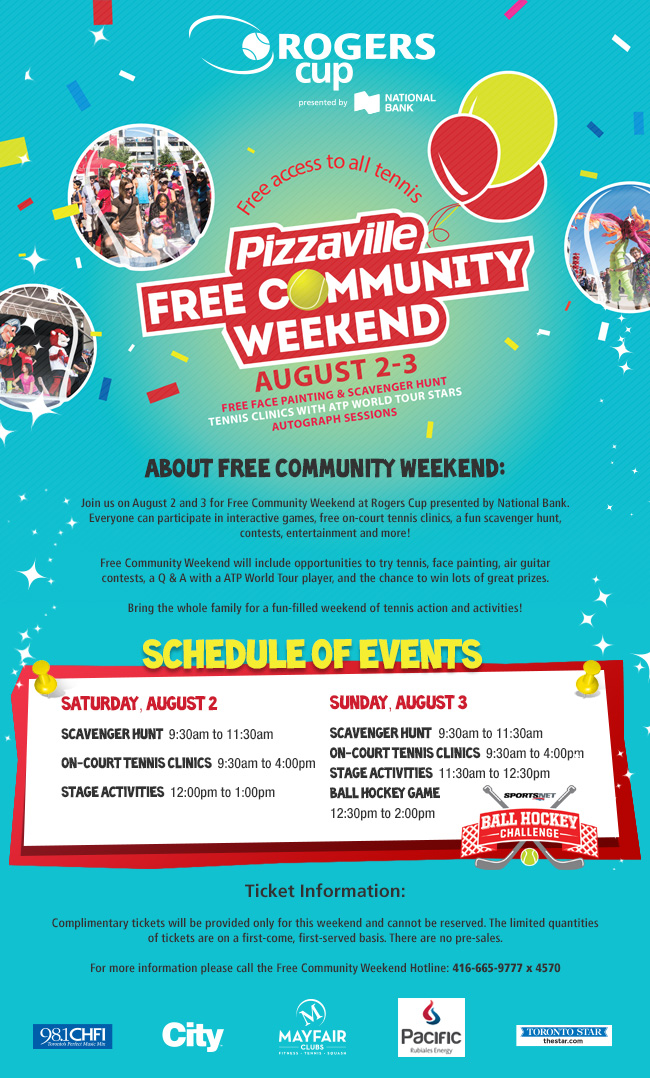 (超级生活记者陈圆圆报道)一年一度加拿大网球盛事2014 Rogers Cup 罗渣士杯网球公开赛本周末正式开始。 而这个周末更有Pizzaville Free Community Weekend,除了网球主题的活动之外,还有适合所有人参与的娱乐游戏。