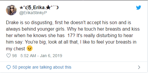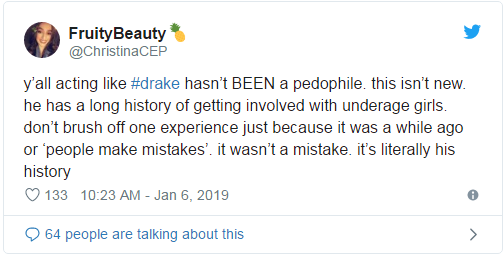 你们表现得好像德雷克不是恋童癖,其实对他来说这件事情并不新鲜,他和未成年女孩交往的历史很长。不要说都过去了或者是人们都会犯错这种类似的言论来掩盖人们的错误,这并不是一时的错误,这就是他这个人的历史,是他的一部分。