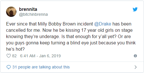 自从Milly Bobby Brown的那次事件发生后,我就对德雷克没什么好感了。他竟然在舞台上亲吻一个17岁的女孩,而且他明明知道女孩未成年!这样对你们来说还不过分吗?或者你们只是因为觉得他很性感就睁一只眼闭一只眼?