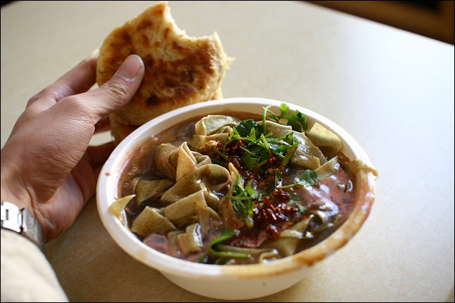 6. 食用时,将“嘎巴”投入盛有卤子的容器内,适当搅拌,盛入碗内,并根据各人口味,加入腐乳汁、辣椒糊、香干片、芝麻酱和香菜末。