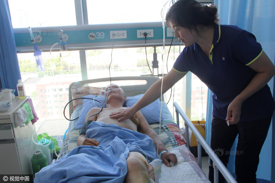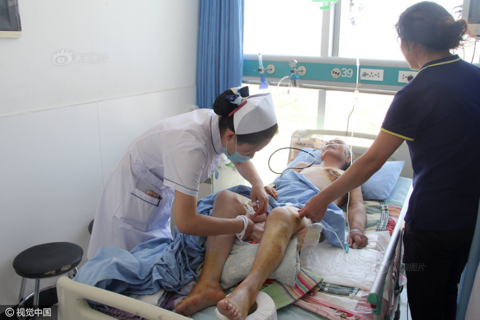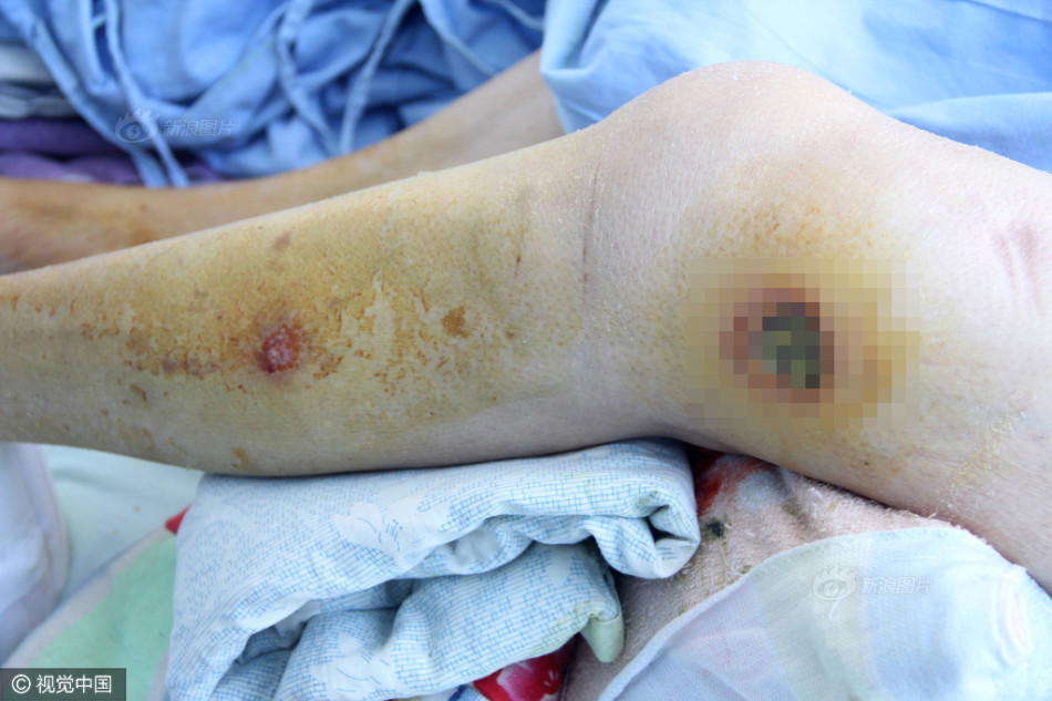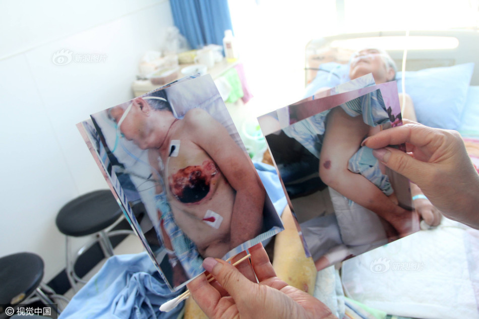 在该院住院部17楼记者见到了仍在接受治疗的于爱英老人,护士正为老人伤口上药,老人嘴里插着管子无法说话,左侧乳房存在明显伤痕,几乎与身体其它部位齐平,此外腿部还有伤疤以及淤青痕迹。图片来源:视觉中国
