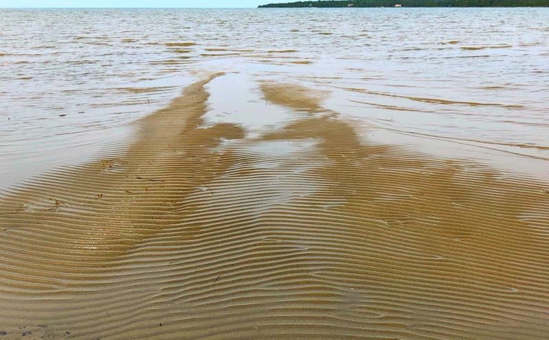 离开国家公园,慕名来到享有金色沙滩美誉的Singing Sand Beach ,最让人惊奇的是水中的沙滩呈现规则的五线谱纹线,在夕阳下变成了一本金色的五线谱音符,让人有一种想跟着音符欢跳的冲动,于是乎,所幸脱去鞋袜,下湖与沙滩、湖水共舞,这就是“歌唱沙滩”的由来。