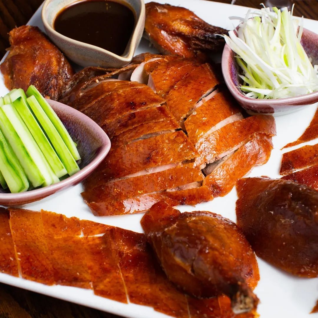 使得鸭肉的原汁原味被唤醒,出炉后由大厨片鸭上桌。每一片鸭肉的色泽鲜艳,肥润香浓,口感绝佳!